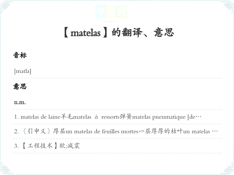 〈引申义〉厚层un matelas de feuilles mortes一层厚厚的枯叶un matelas de billets de banque〈口语〉厚厚的一叠钞票