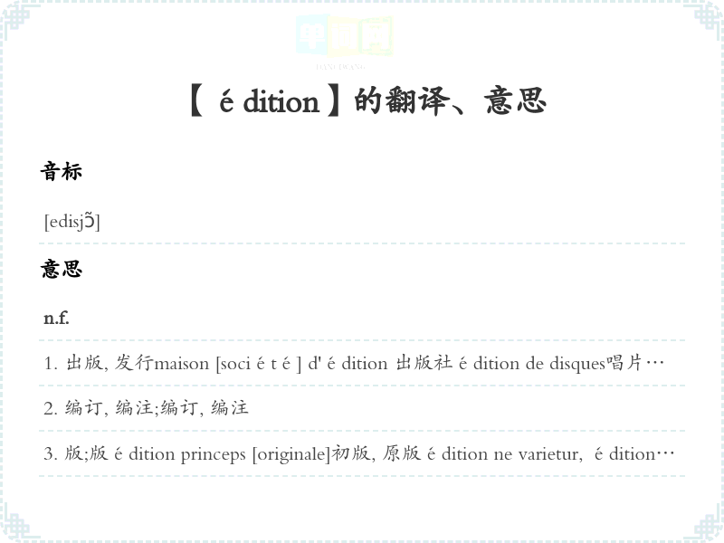 版;版édition princeps [originale]初版, 原版édition ne varietur, édition définitive定版, 定édition corrigée修订版, 修订édition de luxe, 豪华édition de poche袖珍édition spéciale(报刊的)特刊, 号外édition de Paris(报刊的)巴黎版acheter une édition originale买一初版书Troisième édition !〈转义〉〈口语〉这是第三次(提起)了!(你已经讲了)三遍啦!