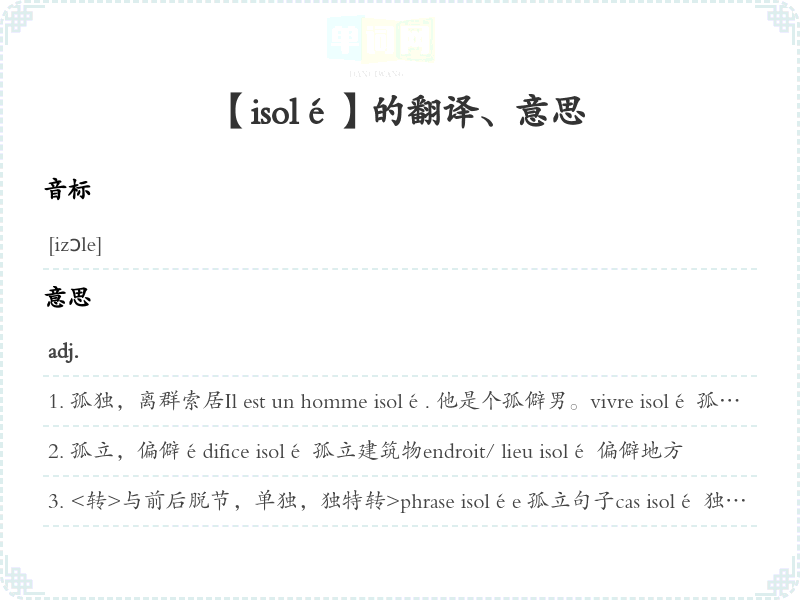 【isolé】 派生:、 近义词:、 反义词: 联想词