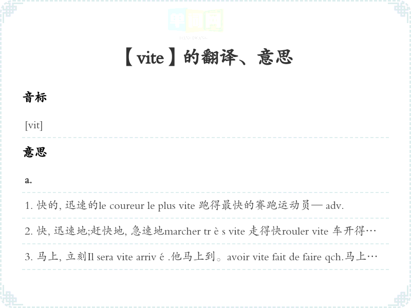 快, 迅速地;赶快地, 急速地marcher très vite 走得快rouler vite 车开得快Il faut vite se préparer.应该赶快准备。au plus vite , le plus vite possible尽可能快plus vite que le vent比风还快的, 风驰电掣一般的Il y va un peu vite .他太草率了一点。Allons vite , dépêchez-vous!哦, 快, 赶紧些!