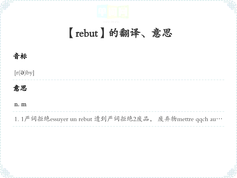 1严词拒绝essuyer un rebut 遭到严词拒绝2废品, 废弃物mettre qqch au rebut 把某物报废marchandise de rebut 劣质商品bois de rebut 废木料3死信, 无法投递信件détruire les rebuts 销毁死信4<转>渣滓, 败类le rebut de la société 社会渣滓le rebut d'une population 民众败类转>