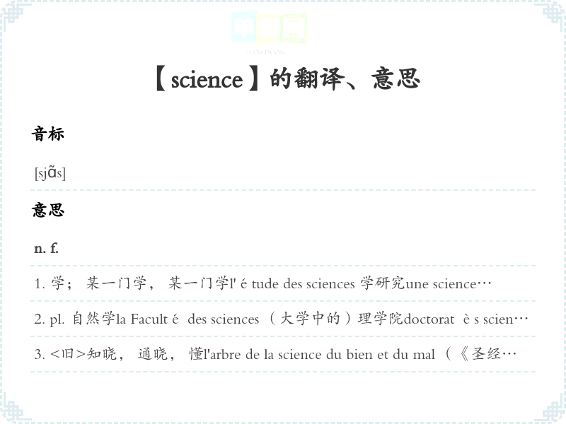 <旧>知晓, 通晓, 懂l'arbre de la science du bien et du mal (《圣经》中伊甸园里的)知善恶的树,开知识的树savoir qch. de science certaine 确实知道某事avoir la science infuse 生来就什么都知道,什么都懂