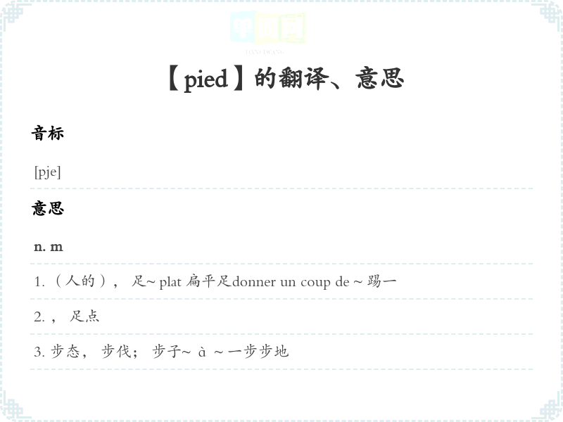【pied】 词根:、 联想:、 近义词:、 反义词: 联想词