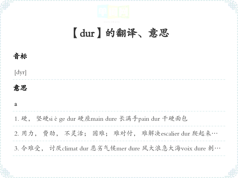 冷酷, 苛刻, 无情, 狠心regard dur 冷酷目光répondre sur un ton dur 用生硬口气回答La critique fut dure pour son ouvrage. 对他作品评论很尖锐。adv.<口>猛烈地, 用力地; 艰苦地, 努力地口>frapper dur 猛travailler dur 勤奋地工作n.m.