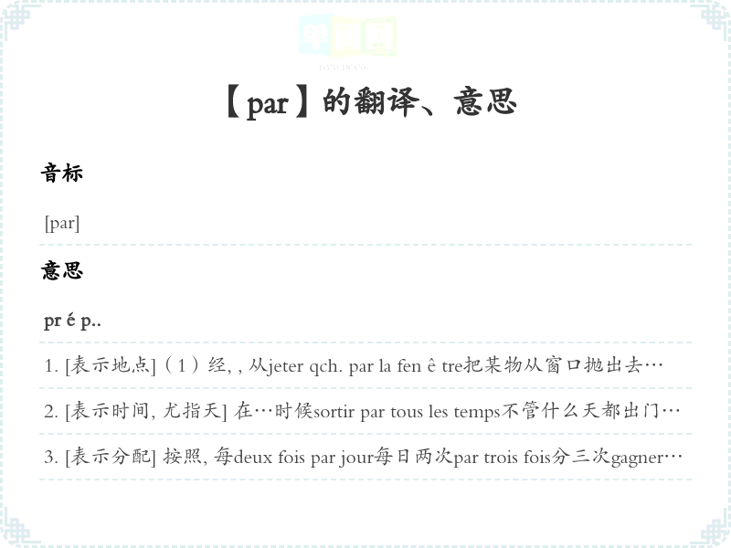 [表示地点](1)经, , 从jeter qch. par la fenêtre把某物从窗口抛出去passer par le couloir穿passer par Nanjing经南京voyager par mer [par air, par terre]海上 [空中, 陆上] 旅行passer par de rudes épreuves经受严峻考验Cette idée lui est passée par la tête.这个念头闪他的脑海。(2)遍, 跑遍aller par de tortueux chemins de montagnes在崎岖的山路上courir par les rues在街上到处奔跑aller (de) par le monde遍全世界(3)在…地方être assis par terre席地而坐se trouver par 30° de latitude Nord et 120° de longitude Est位于北纬30度、东经120度le heurt par l'avant de deux véhicules两辆车子迎面相撞