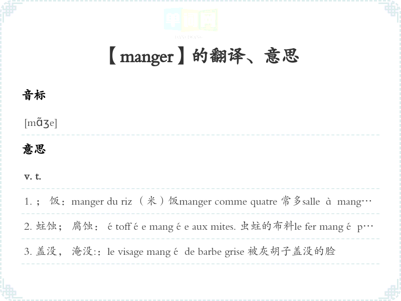; 饭:manger du riz (米)饭manger comme quatre 常多salle à manger 餐厅[转]manger son blé en herbe 寅卯粮manger la consigne 忘记命令manger le morceau [民]咬出同党, 完全供认manger ses mots 说话含糊不清manger son pain blanc le premier 先甜后苦。 从最称心的部分开始做起manger de la vache enragée 过着一贫如洗的生活manger qn des yeux 贪婪地盯住某人manger un bébé de caresses 对一婴儿倍加爱护Il ne vous mangera pas. 他不会掉你。 你不用怕他。 Il y a à boire et à manger. 此事有利有弊。je ne mange pas de ce pain-là. 我不屑于做这种事。我不会因五斗米折腰。