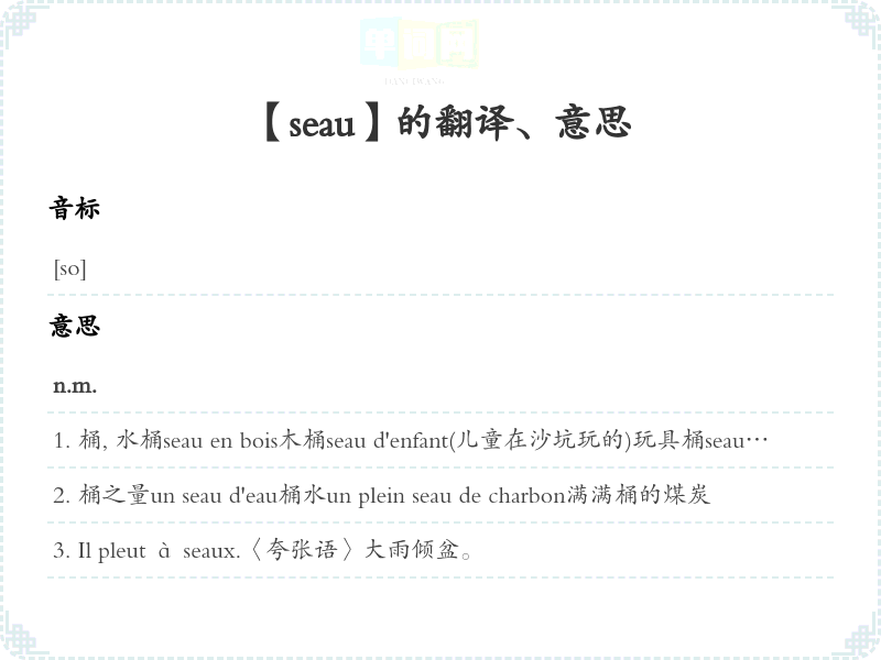 桶之量un seau d'eau桶水un plein seau de charbon满满桶的煤炭