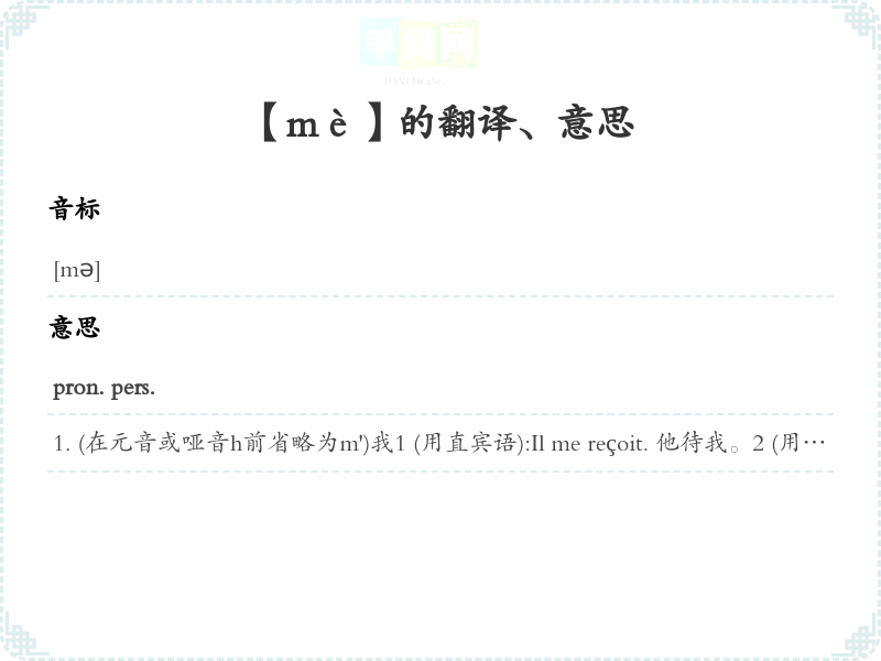 (在元音或哑音h前省略为m')我1 (用直宾语):Il me reçoit. 他待我。2 (用宾语, 表示“对我”, “给我”):Il veut me parler. 他想要跟我说话. Donnez m'en 请给我一些3 (用形容词、表语补语, 表示“对我说”):Votre conseil m'est très chef. 你劝告对我很宝贵4(在falloir, faire, laisser等动词后不定式句中主语):Il me faut obéir à la règle. 我应该遵守规章。 Il me laissera lire ce livre. 他将让我阅读这本书。5 (代替mon, ma, mes):Le cœur me bat fort. 我心跳得厉害。6 (加强语气用法):Va me fermer cette porte!去把这门给我关上!7 (用自反人称代词):Je me suis blessé moi-même. 我是自己弄伤8 (和voici, voilà连用):Me voilà tranquille. 我现在可安心了.