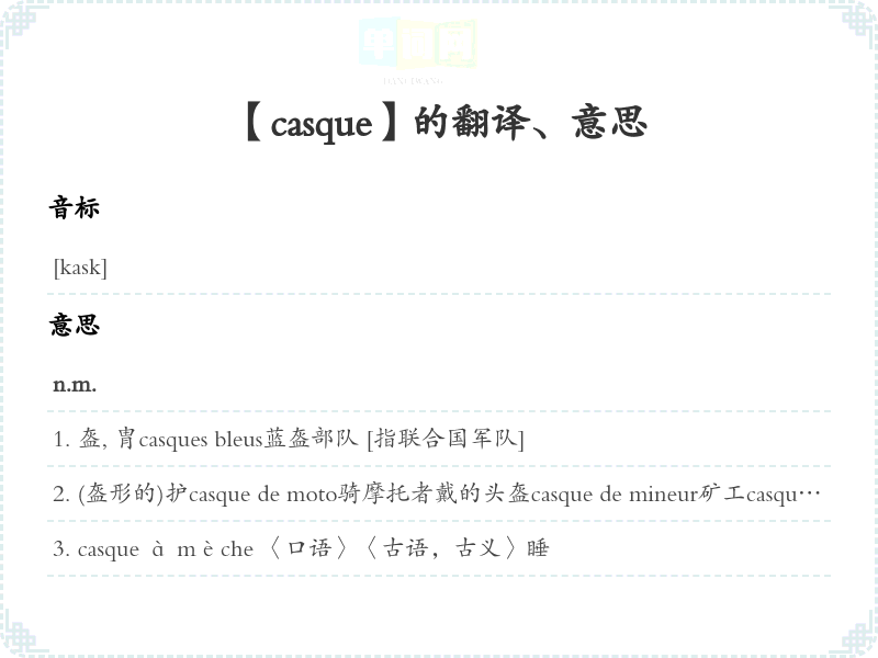 【casque】 派:、 近义词、 同音、近音词 联想词