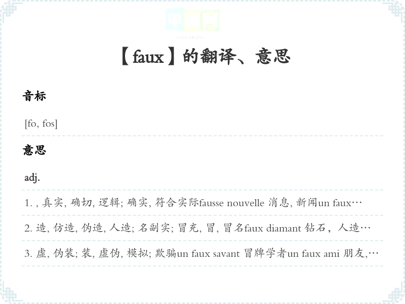 【faux】 词源:、 名词变化:、 形容词变化:、 动词变化:、 副词变化:、 近义词、 反义词、 同音、近音词 联想词