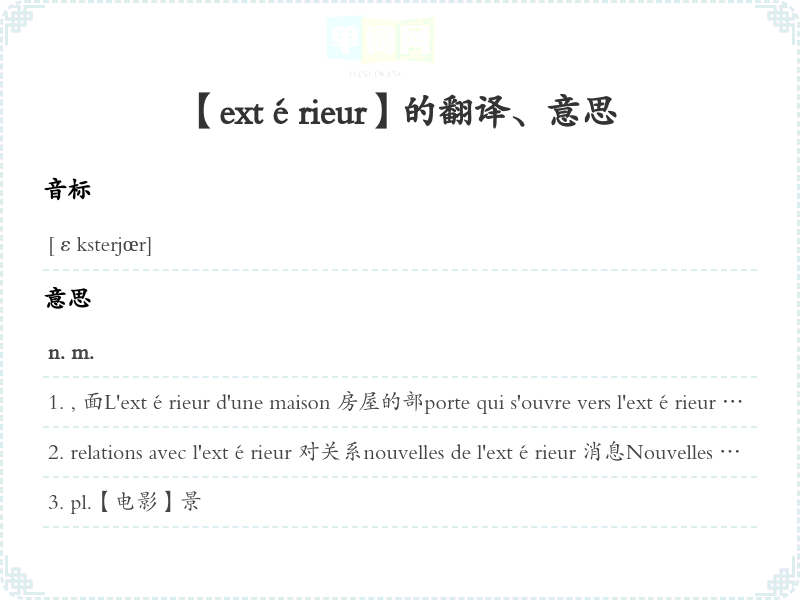 【extérieur】 联想:、 近义词:、 反义词: 联想词