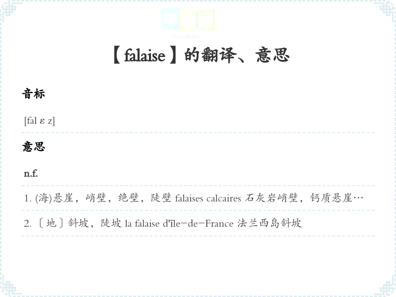 (海)悬崖,峭壁,绝壁,陡壁 falaises calcaires 石灰岩峭壁,钙质悬崖falaises crayeuses 白垩质陡壁Le jardin s'accrochait partiellement à la falaise (Vian). 花园部分座落在悬崖上。(维昂)