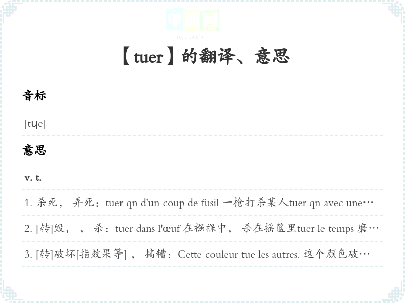 杀死, 弄死:tuer qn d'un coup de fusil 一枪打杀某人tuer qn avec une épée 用剑刺死某人tuer qn par le poison 用毒药毒死某人Est-ce que ce n'est pas à les tuer? Ils mériteraient qu'on les tue! Ils sont à tuer. 这些人真是该杀!tuer les insectes 杀虫Le froid a tué les plantes. 严寒使植物冻死了。 un coup à tuer un bœuf 狠狠一击tuer la poule aux œufs d'or 杀鸡取蛋, 竭泽而渔tuer le ver [俗]空腹喝一杯烧酒[相传有驱肠虫之效][宾语省略]boucher qui tue deux fois par semaine 每周屠宰二次的屠户poison qui tue 致死的毒药[p. p. 用作n. ] Il y a eu mille tués et cinq mille blessés. 死一千人, 伤五千人