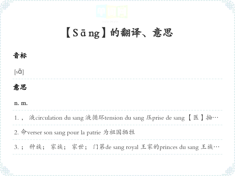 ; 种族; 家族; 家世; 门第de sang royal 王家的princes du sang 王族la voix du sang 骨肉情义sang bleu 贵族Bon sang ne peut mentir. <谚>龙龙, 凤凤。 [也用于讽刺](cheval) pur-sang 纯种马谚>