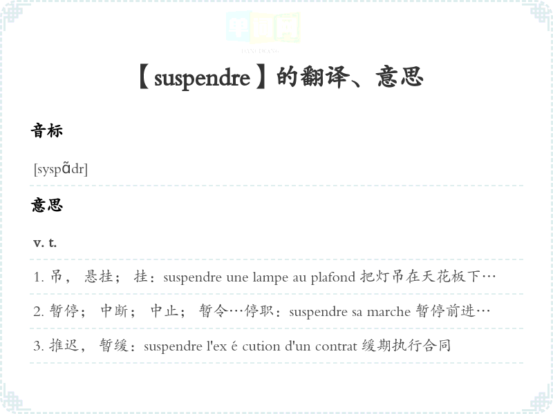 暂停; 中断; 中止; 暂令…停职:suspendre sa marche 暂停前进suspendre une séance 休会suspendre un journal 将报纸暂时停刊suspendre un maire 暂停一个市长的职务suspendre ses paiements [商]停止付款, 止付