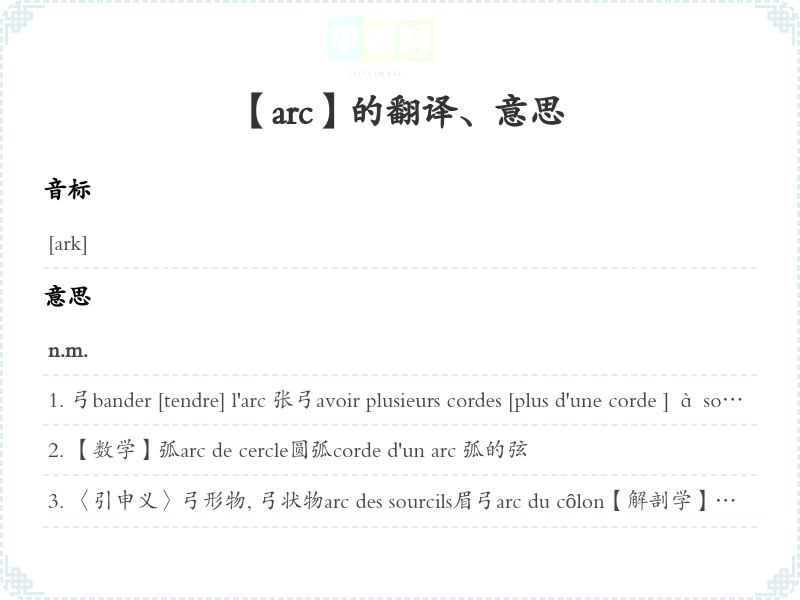 〈引申义〉弓形物, 弓状物arc des sourcils眉弓arc du côlon【解剖学】横结肠arc réflexe【生理学】反射弧arc électrique【电学】电弧lampe à arc 【电学】弧光灯