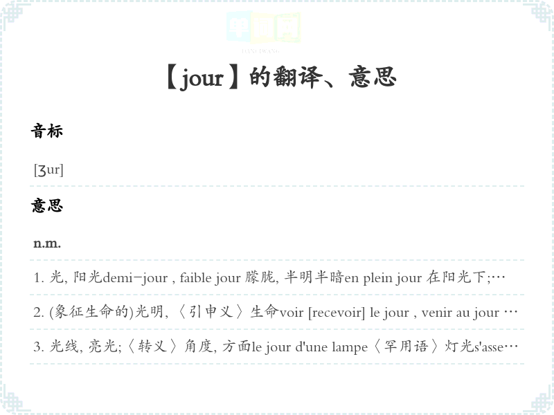 光, 阳光demi-jour , faible jour 朦胧, 半明半暗en plein jour 在阳光下;在大白天se lever au petit jour 天蒙蒙亮就起身la tombée du jour 黄昏l'astre du jour 〈诗歌用语〉太阳Le jour point.破晓。Il fait jour. 天亮了。être beau comme le jour 非常美丽être comme le jour et la nuit 完全相反, 截然不同clair comme le jour 清清楚楚, 明明白白Demain il fera jour. 别急, 等一等再说。
