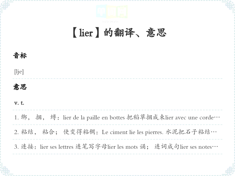 连接:lier ses lettres 连笔写字母lier les mots 诵; 连词成句lier ses notes [乐]圆滑地演奏或演唱lier les pensées 使思想贯起来
