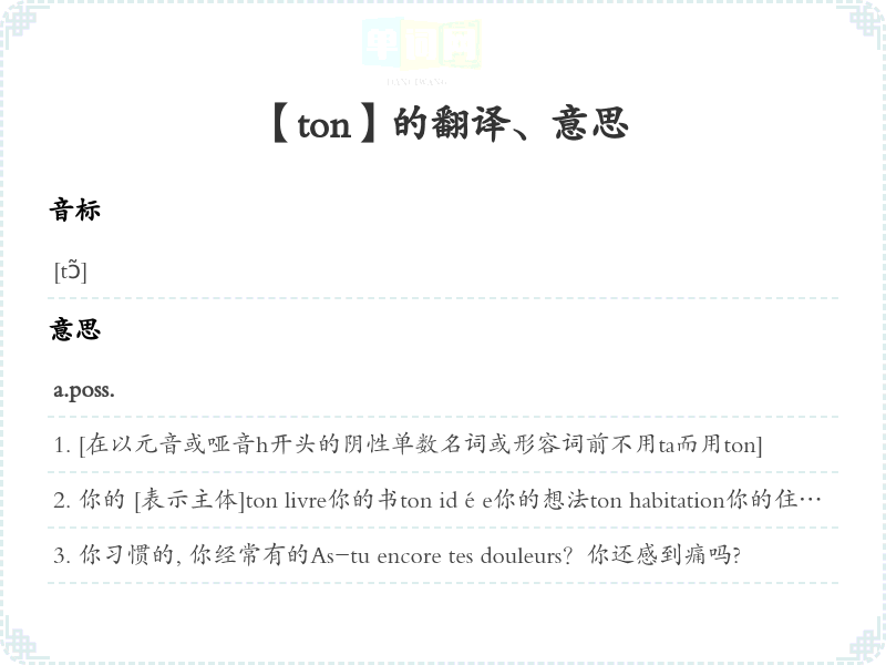 你的 [表示主体]ton livre你的书ton idée你的想法ton habitation你的住所ta pomme〈行话〉你tes parents你的父母Ferme donc ta porte.把你(房间)的门关上。