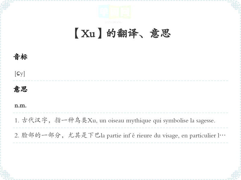 古代汉字,指一种鸟类Xu, un oiseau mythique qui symbolise la sagesse.