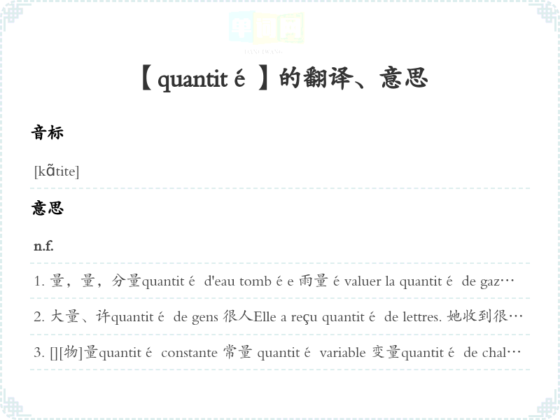 【quantité】 联想:、 名词变化:、 动词变化:、 形容词变化:、 副词变化:、 近义词:、 反义词: 联想词