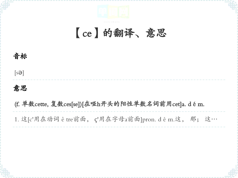 这, 那; 这, 那[指人事物]1[用作无人称主语, 强调语气]Ce doit être lui. 大概是他。 Ce ne peut être cela. 不可能是这。 C'est nous. 是我们。 Ce sont eux. 是他们。 C'est mon ami et son frère. 这二位是我朋友他兄弟。 Ç'a été un brave homme. 他当初是正直的人。 Ce n'est pas des romans, c'est des dictionnaires. 这些不是小说, 是词典。 [口语中语表语可不一致]si ce n'est. . . 除此, 除非, 莫非…fût-ce. . . 哪怕是…2[用于疑问句中]Est-ce vous?是您吗?Est-ce que vous viendrez ce soir?今天晚上您来吗?Qu'est-ce(que c'est)?<口>Qu'est-ce que c'est que cela?这是什么?这是怎么一回事?ce que c'est que是什么 口>3[用于句首表示强调]C'est. . . qui, C'est. . . que是…4c'est à. . . de. . . 这是应该由…去…; 真要…5[代词合用, 作为主语、宾语、表语等]Voyez ce qui se passe. 请看一下发生了什么事。 瞧瞧眼下所发生的事。 Faites ce que je vous dis. 按我跟您说的做吧。 à ce que je crois在我想来à ce qu'il me semble依我看ce dont on parle所谈论的这件事情Voici ce à quoi j'avais pensé. 这就是我曾经想过的。 Sa santé n'est pas ce qui me préoccupe. 我担心的并不是他的健康。6 ce que<口>多么7[用作直接宾语]口>ce dit-il<古>他说了这ce me semble我觉得这样pour ce faire为了做这件事; 为此目的 古>8[现在分词一起, 构成独立分词句, 用在句首]ce disant说着9[用作介词的补语]sur ce于是, 随后, 这时候