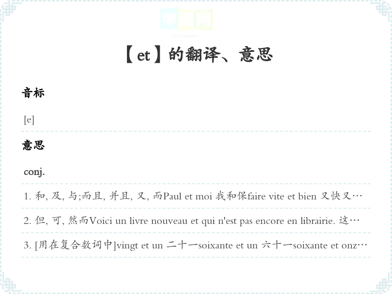 和, 及, 与;而且, 并且, 又, 而Paul et moi 我和保faire vite et bien 又快又好Deux et deux font quatre. 二加二等于四。Taisez-vous et écoutez. 别说了, 听着。Il y a livres et livres. 书有种种, 有好有坏。passer et les monts et les mers 越过高山大海Il parle français, et couramment. 他会讲法语, 而且讲很流利。J'ai accepté. Et vous? 我接受了。您呢?