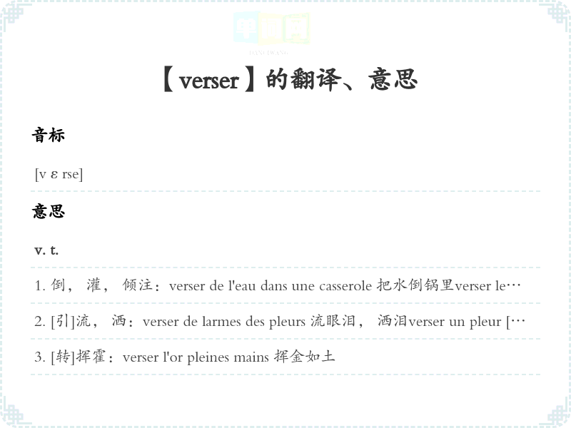 倒, 灌, 倾注:verser de l'eau dans une casserole 把水倒锅里verser le thé 倒茶verser du vin dans un verre 往酒杯里倒酒, 斟一杯酒[宾语省略]verser à boire 斟酒se verser du champagne 给自己斟香宾酒