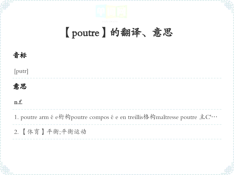 poutre armée桁构poutre composée en treillis格构maîtresse poutre 主C'est la paille et la poutre .〈转义〉严于责人, 宽于责己。