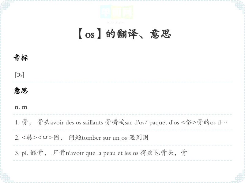 骨, 骨头avoir des os saillants 骨嶙峋sac d'os/ paquet d'os <俗>骨的os de seiche 乌贼骨,墨斗鱼骨俗>