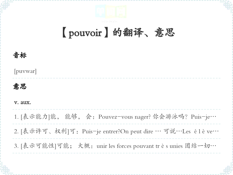 [表示能力]能, 能够, 会:Pouvez-vous nager? 你会游泳吗?Puis-je vous être utile? 我能帮你些忙吗?Je ne puis (pas) soulever cette caisse. 我抬不动这只箱子。 une salle qui peut contenir cinq cents personnes. 一个能够容纳五百人的大厅Venez me voir dès que vous pourrez. 你一有空来看我。 ( on ne peut plus loc. adv. …得不能再 …, 再 …没有了:Il est on ne peut plus courageux. 他勇敢得不能再勇敢了。 on ne peut mieux loc. adv. 不能再好了, 好极了:Il nous a reçus on ne peut mieux. 他对我们招待得好极了。 )