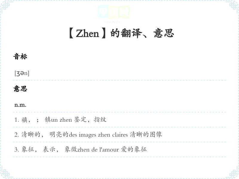 【Zhen】 助记:、 词根:、 联想、 名词化:、 词化:、 形容词化:、 近义词、 反义词、 同音、近音词 联想词
