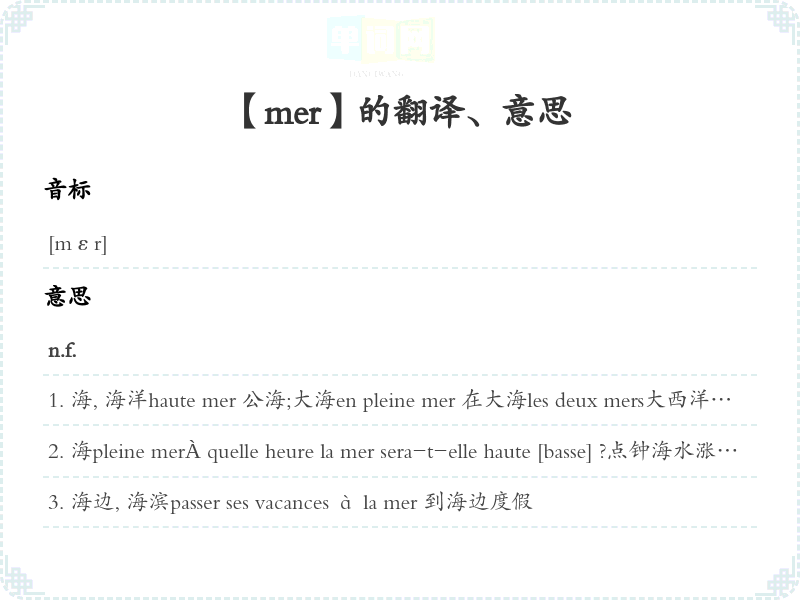 海, 海洋haute mer 公海;大海en pleine mer 在大海les deux mers大西洋和地中海armée de mer 海军bras de mer 海峡mal de mer 晕船port de mer 海港coup de mer 阵风暴;阵巨浪gens de mer 海员vent de mer 海风navigation en mer 海上航行voyage par mer 航海旅行combat sur mer 海战prendre la mer 出海, 出航avoir la maîtrise de la mer 掌握制海权tenir la mer 在海上航行, 在海上巡逻, 游弋;掌握制海权Le navire tient bien la mer .这艘海船航海性能良好。droit de la mer 海洋法mer nationale内海mer territoriale领海un homme à la mer 掉在海里的人; 〈转义〉处于穷途末路的人, 听任命运摆布的人une goutte d'eau dans la mer 沧海粟, 杯水车薪Ce n'est pas la mer à boire.这不是难于登天的事。