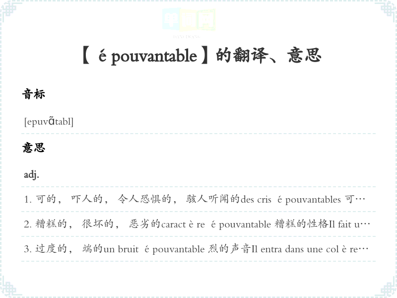 糟糕的, 很坏的, 恶劣的caractère épouvantable 糟糕的性格Il fait un temps épouvantable. 天气恶劣。