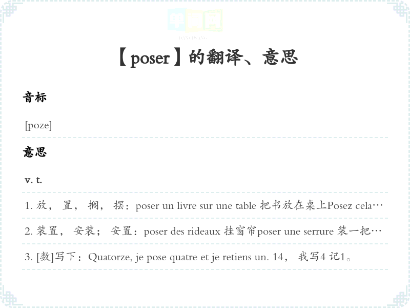 放, 置, 搁, 摆:poser un livre sur une table 把书放在桌上Posez cela à (par)terre. 把这个放在上。 poser un objet droit 把东西直放。 poser un objet de travers (plat) 把东西横[平]放poser son regard sur … [引]把目光投向 …