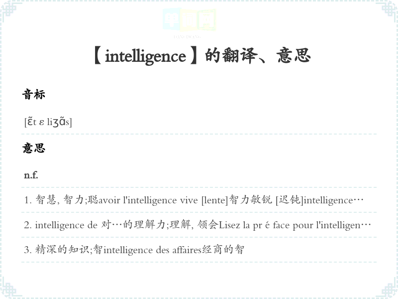 智慧, 智力;聪avoir l'intelligence vive [lente]智力敏锐 [迟钝]intelligence artificielle工智 [缩写为I.A.]