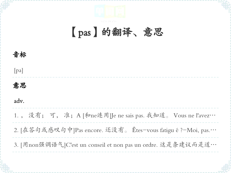 , 没有; 可, 准;A [和ne连用]Je ne sais pas. 我知道。 Vous ne l'avez pas encore vu. 您还没有见到他呢。 Il me dit de ne pas appuyer sur le frein. 他叫我要按制动器。 Je n'en sais pas plus que vous. 对此我知道得并比您多。 Ce n'est pas que(+subj. )并是, 并非B[单独使用]