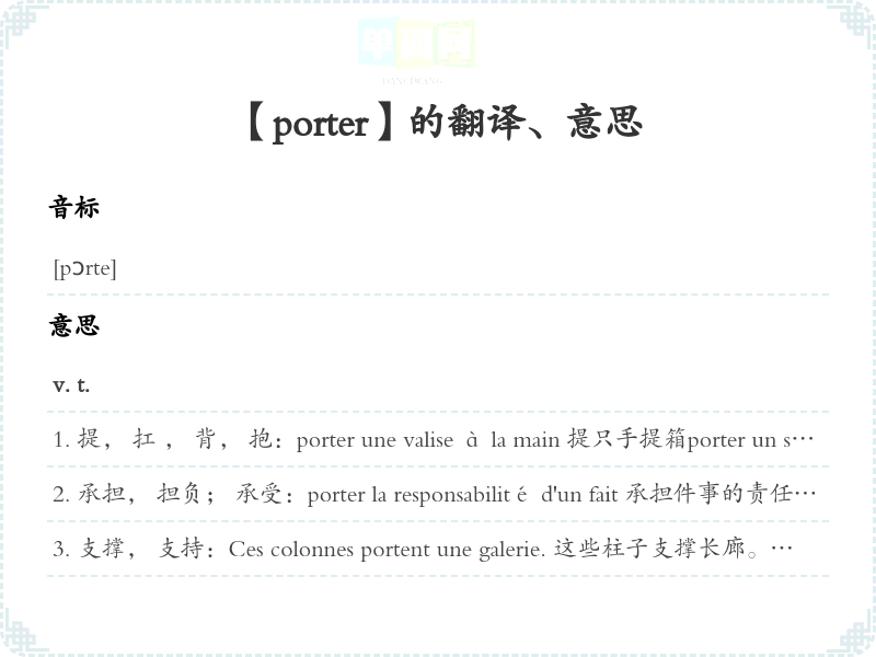 穿戴, 佩带:porter un insigne 佩带徽章[转]:porter les armes 当兵porter la robe 当法官porter la soutane 当教士porter un nom illustre 出身名门Il n'est pas bien porté de … …是不文雅的; …是不合礼仪的。1