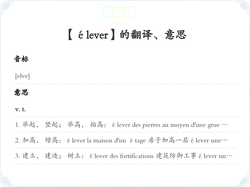 提高:élever la voix 提高嗓门élever la voix pour (contre) qn [转]发言支持[反对]élever le niveau de conscience de classe 提高阶级觉悟