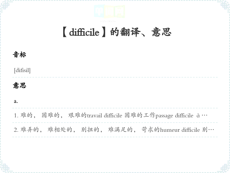 【difficile】 助记:、 派生:、 联想:、 副词变化:、 近义词:、 反义词: 联想词