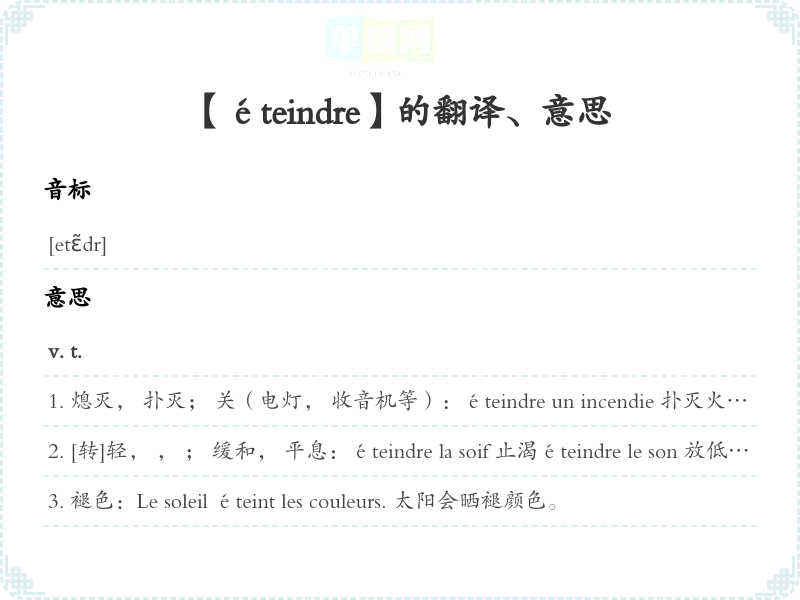 【éteindre】 联想:、 名词变化:、 形容词变化:、 近义词:、 反义词: 联想词