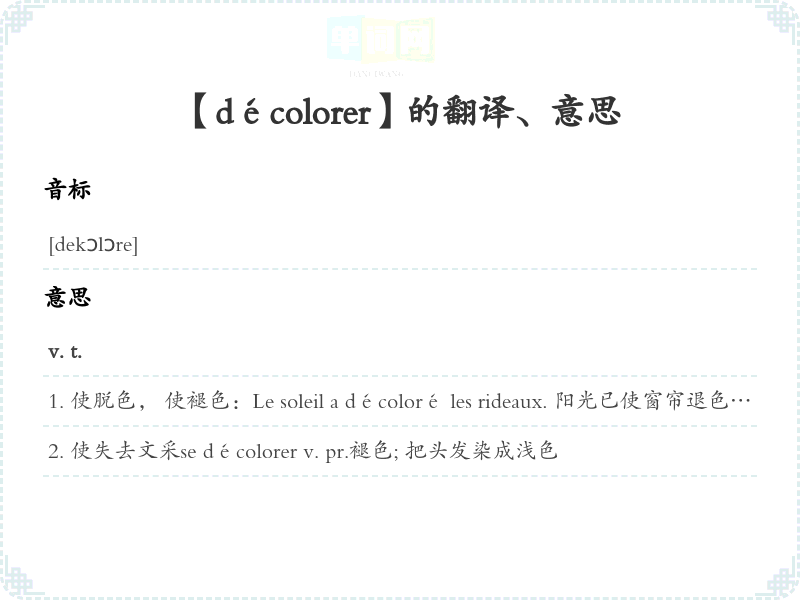 使脱色, 使褪色:Le soleil a décoloré les rideaux. 阳光已使窗帘退色。 se décolorer les cheveux 把头发染淡[宾语省略]Elle s'est décolorée. 她把头发染淡了。