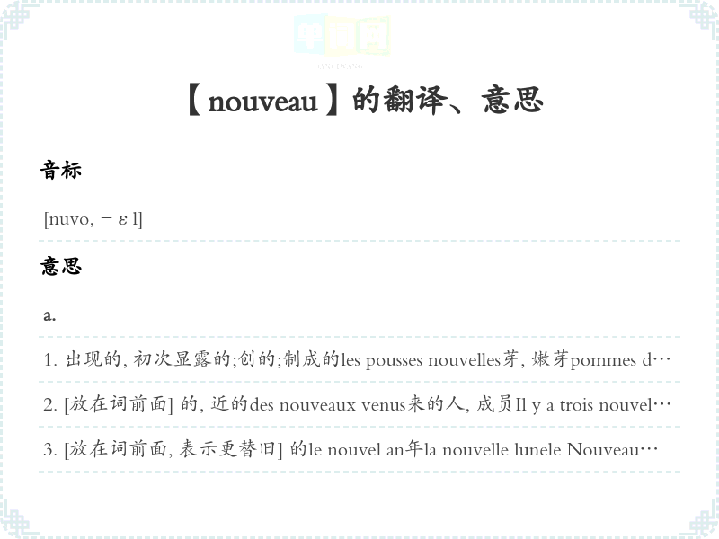 【nouveau】 助记:、 词根:、 派生:、 联想:、 形容词变化:、 近义词:、 反义词: 联想词