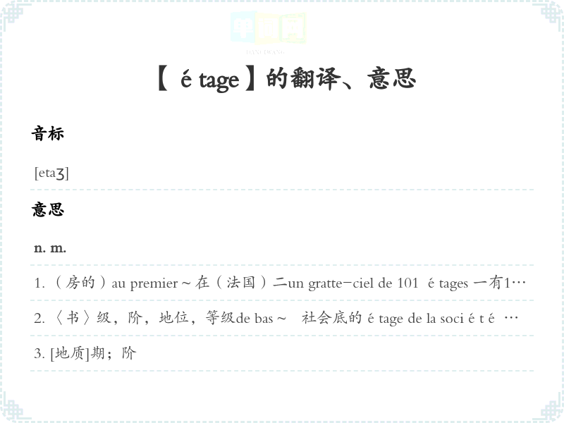 【étage】 联想:、 名词变化:、 词变化:、 近义词:、 反义词: 联想词