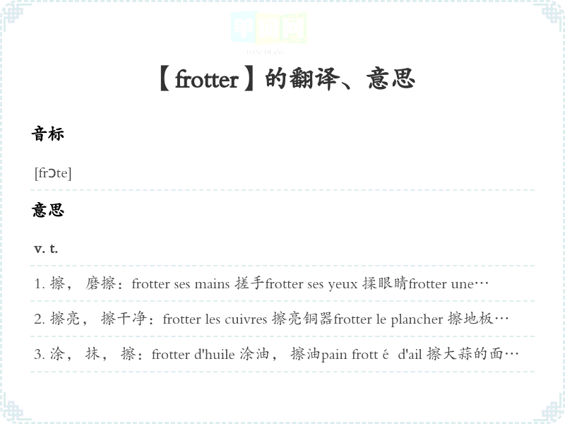 涂, 抹, 擦:frotter d'huile 涂油, 擦油pain frotté d'ail 擦大蒜的面包être frotté de … [旧, 转]懂些…对 …知:être frotté de français 懂点法语
