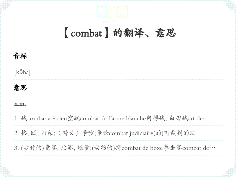 (古时的)竞赛, 比赛, 较量;(动物的)搏combat de boxe拳击赛combat de coqs鸡combat à coups de poing拳combats de gladiateurs(古罗马的)
