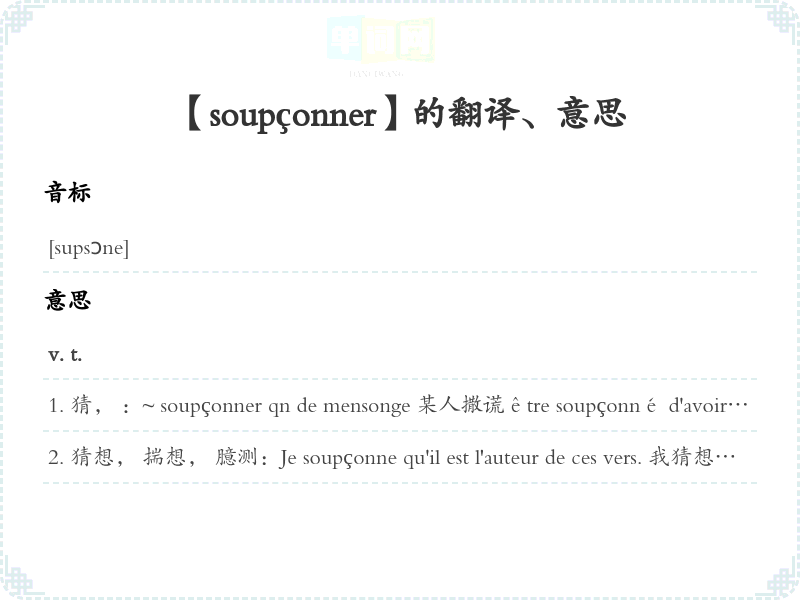 猜, :~ soupçonner qn de mensonge 某人撒谎être soupçonné d'avoir fait qch. 被干过某事La femme de César ne doit pas même être soupçonnée. [谚]即使恺撒之妻不容光焕发也不能。 [喻不能对某人产生]
