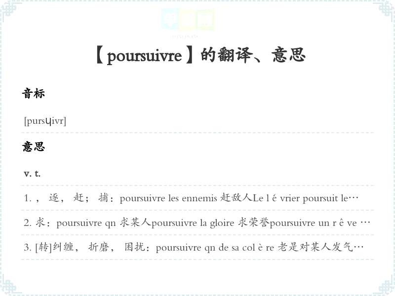 求:poursuivre qn 求某人poursuivre la gloire 求荣誉poursuivre un rêve 逐梦想
