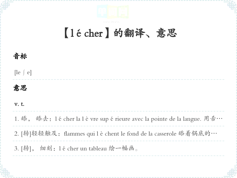 舔, 舔去:lécher la lèvre supérieure avec la pointe de la langue. 用舌尖舔上嘴唇s'en lécher les doigts (les babines) [转]吃得津津有味lécher les bottes de (à) qn, lécher les pieds de (à) qn [转, 俗]拍某人马屁, 低三下四地奉承某人lécher les vitrines [俗]贴近地看商店橱窗