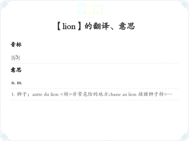 狮子;antre du lion <转>非常危险的地方chasse au lion 捕猎狮子转>士, 非凡者<俗>C'est un lion. 他是一个的人。Ces jeunes soldats furent des lions. 这些年轻士兵都是的人。俗>n.inv. et adj.inv.狮子座(的)Elle est lion. 她是狮子座的。